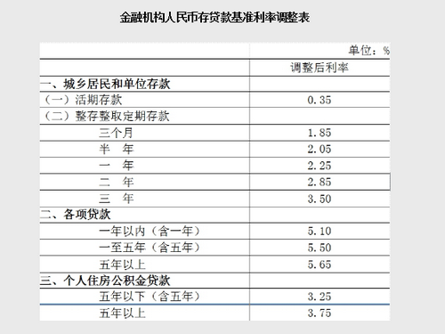 央行決定,自2015年5月11日起下調金融機構人民幣貸款和存款基準利率。金融機構一年期貸款基準利率下調0.25個百分點至5.1%;一年期存款基準利率下調0.25個百分點至2.25%,同時結合推進利率市場化改革,將金融機構存款利率浮動區(qū)間的上限由存款基準利率的1.3倍調整為1.5倍;其他各檔次貸款及存款基準利率、個人住房公積金存貸款利率相應調整。