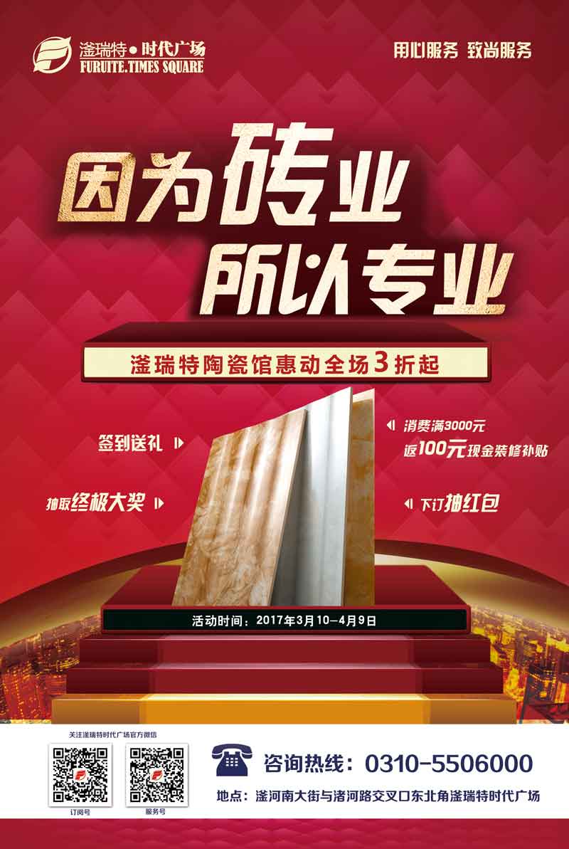 因為磚業,所以專業。2017年3月10日至4月9日滏瑞特時代廣場陶瓷館惠動全場3折起,活動期間成交抽紅包,消費滿3000元抽一次紅包,6000元兩次,以此類推。滿額返現消費滿3000元返100元現金,6000元兩次,以此類推。4月9號下午2點集中爆破,用戶簽到抽取終極大獎,特等獎1名冰箱一臺,一等獎1名蘋果ipad Air一臺,二等獎2名依波情侶手表一對,三等獎3名小米智能手機一部。