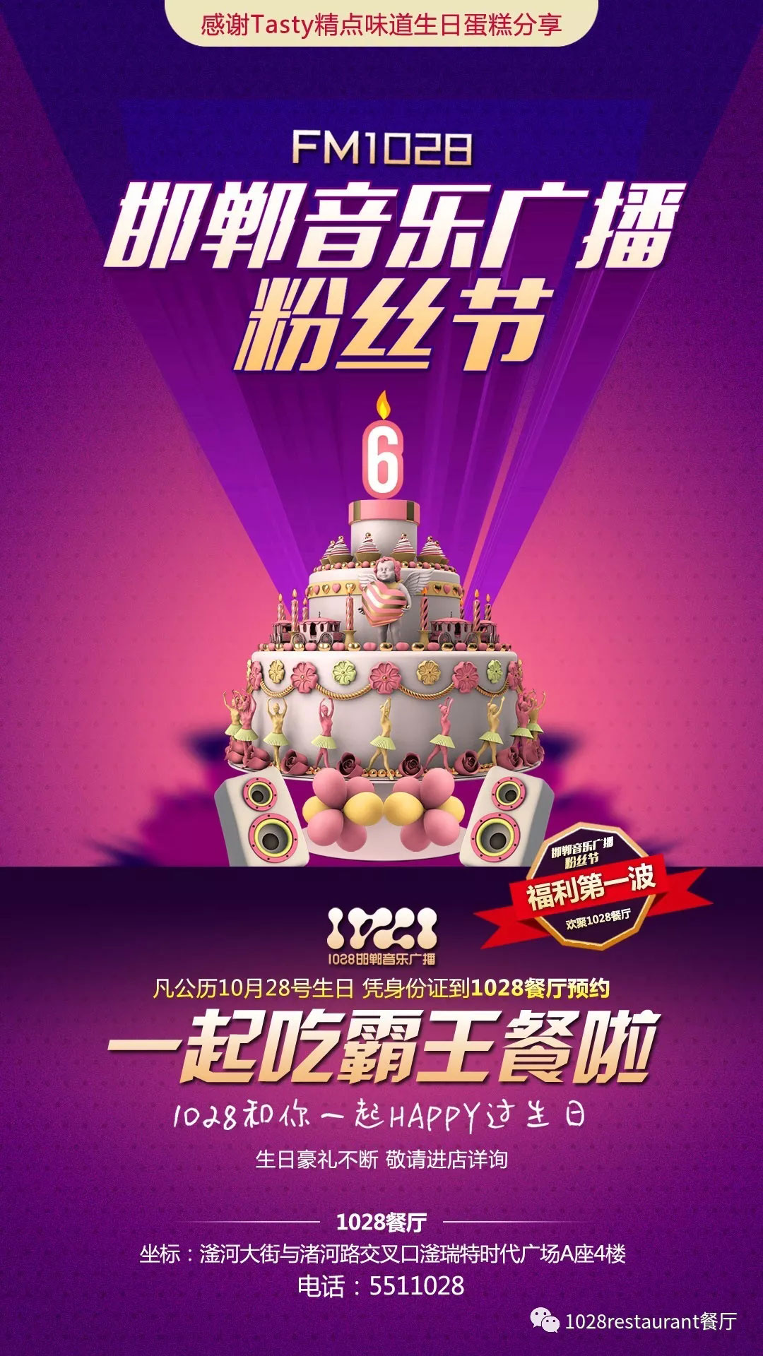 1028餐廳攜手精點(diǎn)味道蛋糕 請您來吃霸王餐!即日起征集前十名壽星(以身份證公歷10月28日為準(zhǔn)),可來餐廳核實(shí)并預(yù)定名額,10月28號晚,我們?yōu)槟鷾?zhǔn)備了豐盛的晚餐。并且當(dāng)晚壽星家屬來店內(nèi)就餐餐桌可享受會(huì)員價(jià)再贈(zèng)送價(jià)值500元親情卡一張。