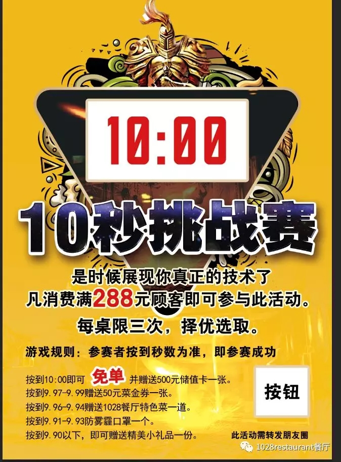 消費(fèi)滿288元即可參與十秒挑戰(zhàn)賽,好禮不斷!(按到10.00秒即可免單)