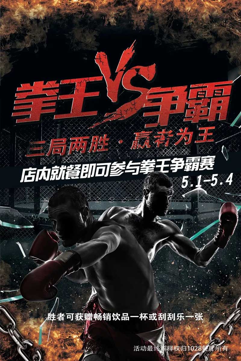 五一小長假期間,在店內(nèi)就餐即可參與拳王爭霸賽,三局兩勝,贏者可獲贈暢銷飲品一杯或刮刮樂一張。